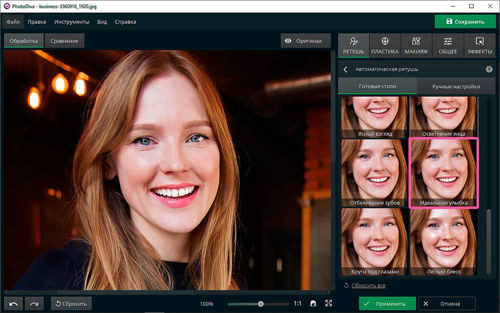 PhotoDiva предлагает ряд готовых стилей обработки. Вы найдёте их во вкладке «Автоматическая ретушь». Каждый включает набор заранее настроенных параметров, которые отвечают за определённые изменения на портрете. Например, «Ясный взгляд» делает область глаз более чёткой и контрастной, «Лёгкий загар» придаёт коже золотистый оттенок и тому подобное. В этом же ряду есть два режима, которые позволяют улучшить улыбку – «Отбеливание зубов» и «Идеальная улыбка».
