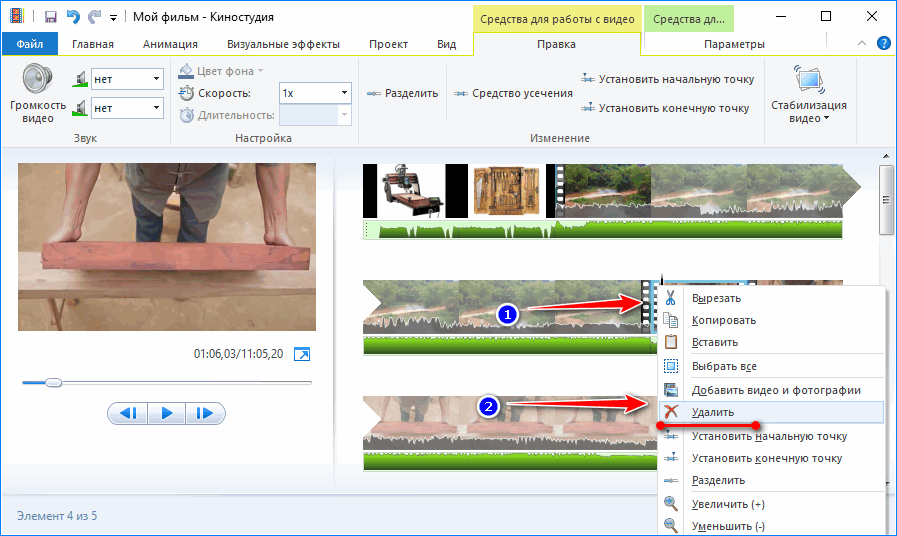 - Перед добавлением видео на монтажный столик его можно обработать. Потребуется увеличить размер окна раскадровки для того, чтобы точнее смонтировать нужный фрагмент. После этого следует воспользоваться средством установления начальных и конечных точек монтажа.