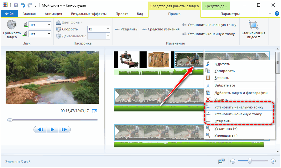 - Установите курсор на желаемом момента начала фильма и через контекстное меню или панель с инструментами для работы с видео вызовите команду «Установить начальную точку».