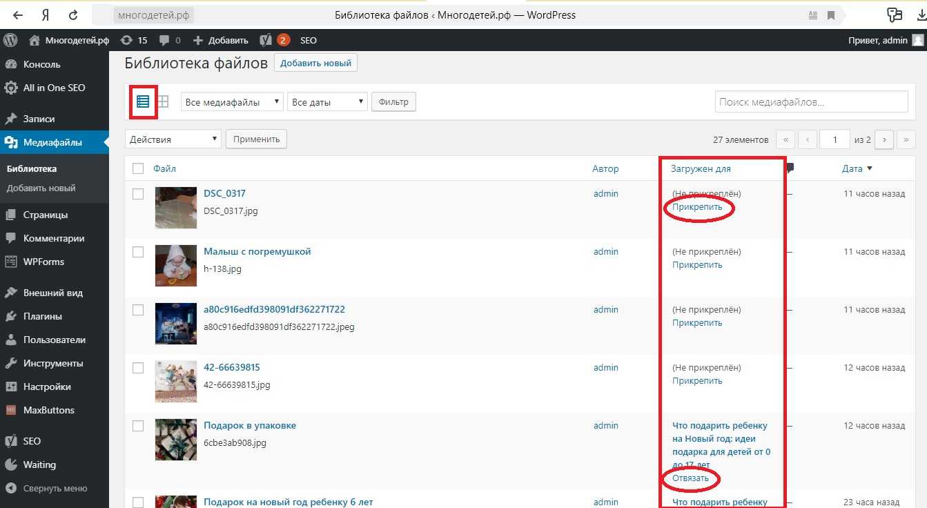 Откроем библиотеку. Отобразим содержимое не в формате сетки, а списком. В таблице напротив названий мы увидим автора, комментарии, дату загрузки и для какой записи предназначен. Если напрямую в библиотеку (не в статью), файл не будет «прикрепленным». Но его можно в любой момент прикрепить, нажав на соответствующую надпись, а прикрепленные – отвязать.