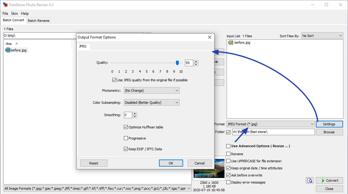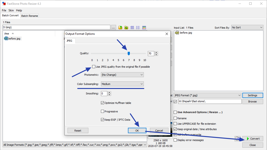 - Качество JPEG как у исходного файла ⇒ галочку не ставим