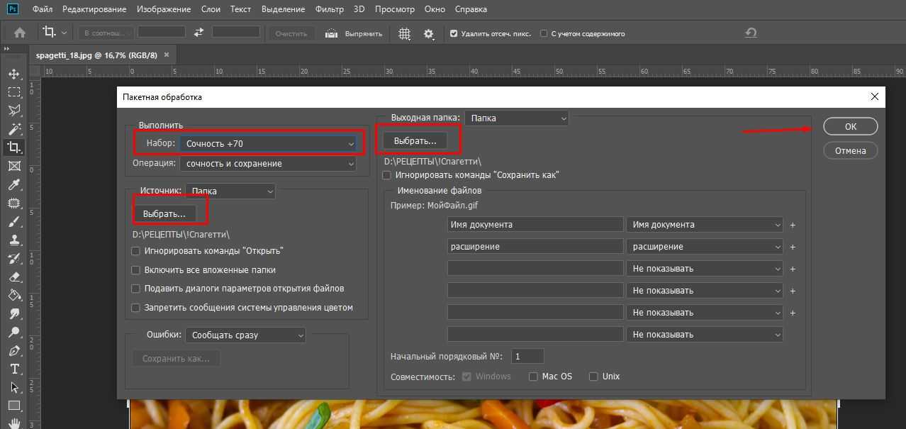 Выходная папка (куда нужно сохранять) – здесь выбираем туже самую папку, где находятся фото. Потому как, мы задали фильтр – сохранить. А он будет перезаписывать имеющееся фото. То есть, процесс будет повторяться для каждого фото в папке. Откроется фото, затем добавится сочность, сохранится и закроется. Таким образом, будет перезапись фото с тем же именем.