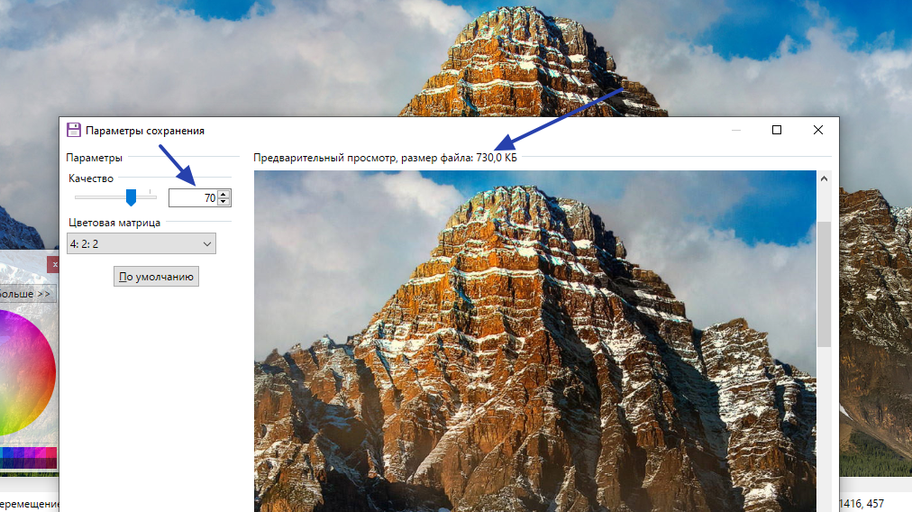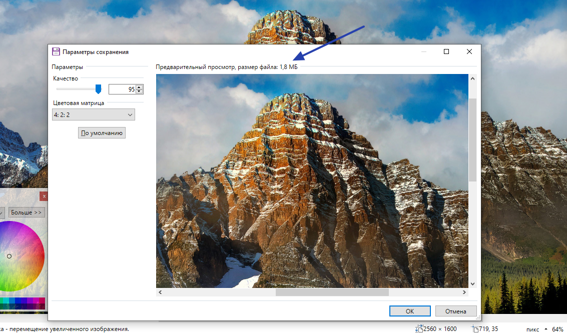 Во всплывающем окне есть параметр «Качество». Он изменяется перемещением ползунка. При этом в окне предварительного просмотра можно оценить качество будущего файла. Сразу же происходит и оценка его «веса» после того, как будет произведено сохранение. Вес фото с двух-трех мегабайт можно понизить до 200-300 килобайт. Это зависит от самого изображения и от Ваших требований к уровню качества.