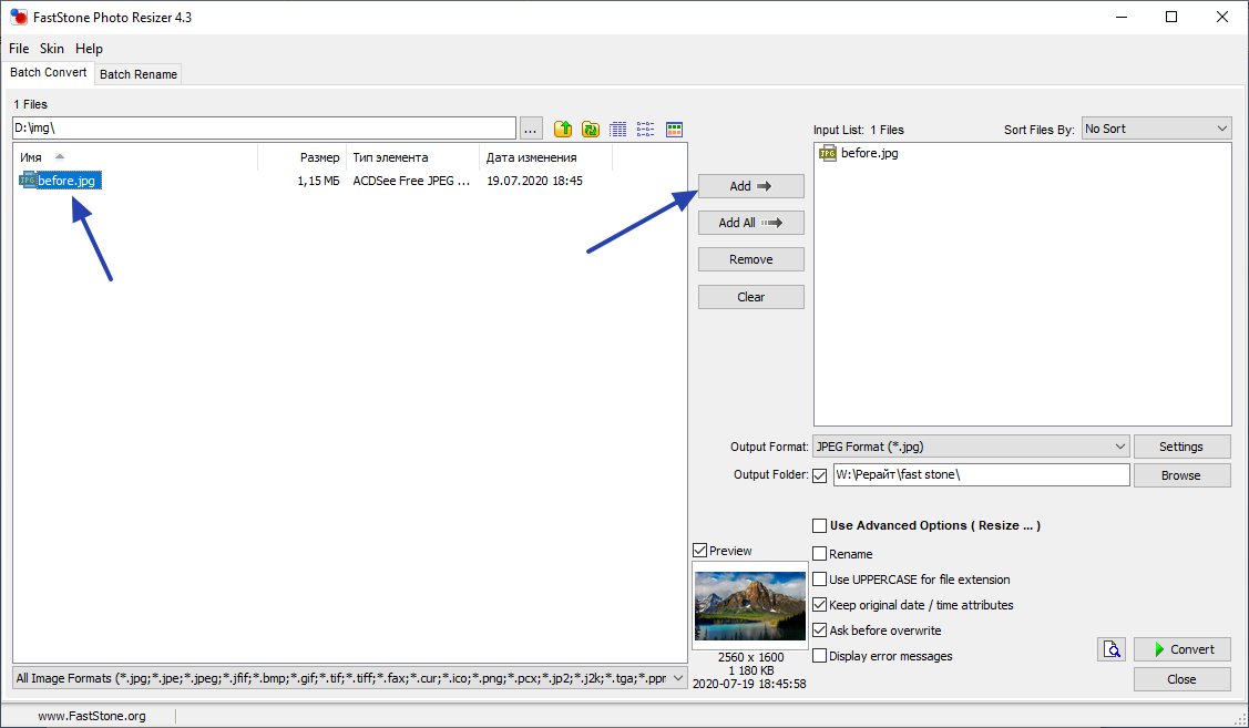 - запустить программу FastStone Image Viewer и перейти в папку с фотографиями подготовленными для сжатия