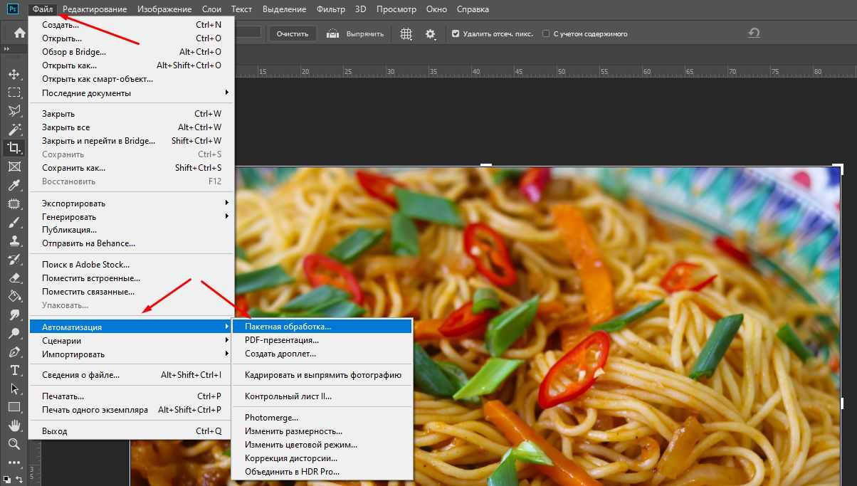 Откройте Файл – Автоматизация – Пакетная обработка…