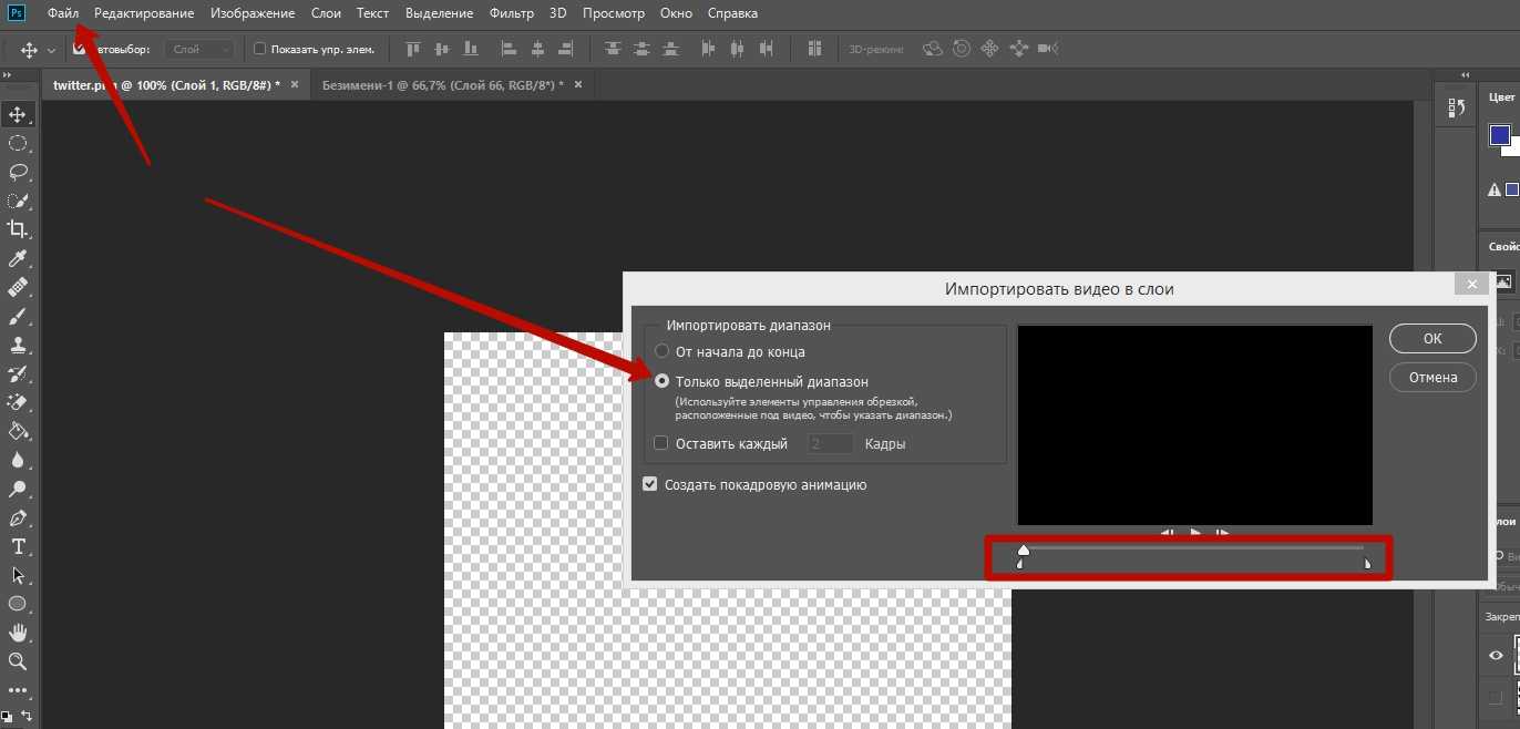 - Откройте Фотошоп и импортируйте файл. Вкладки: Файл => Импортировать => Кадры видео в слои. Все кадры видеоролика будут представлены отдельными слоями.