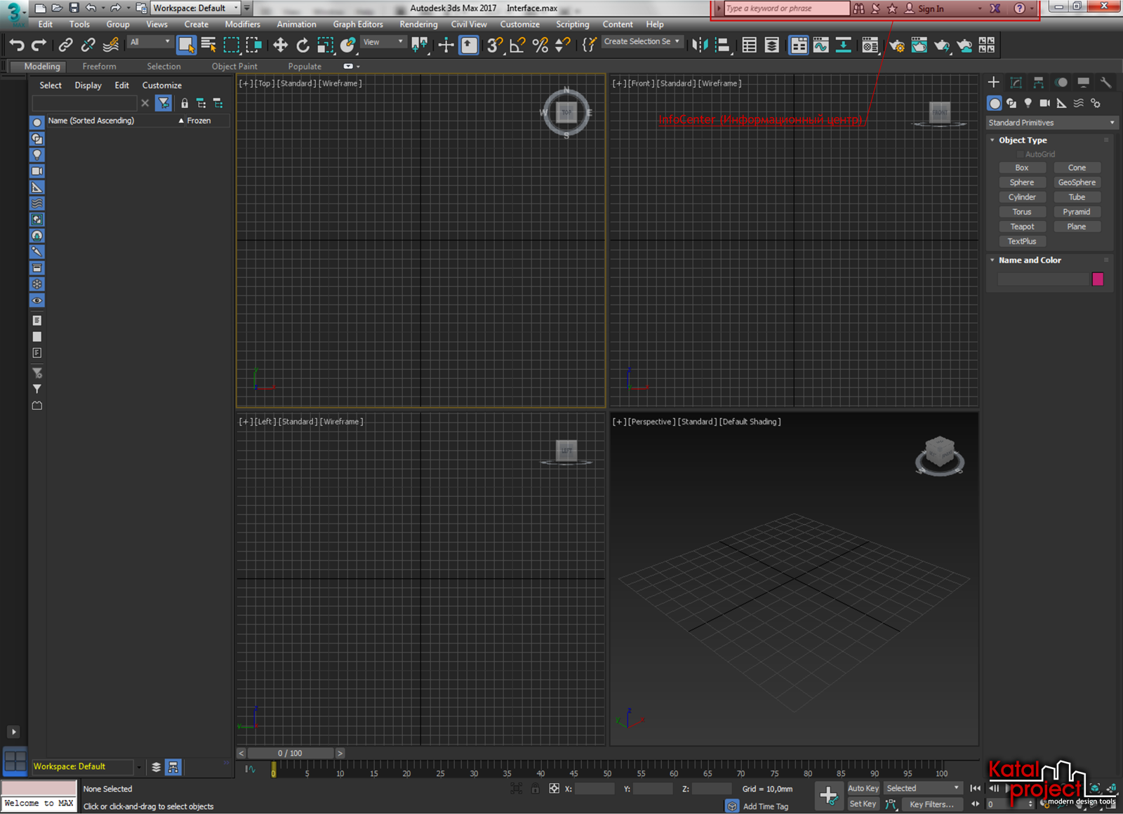 В правой части Caption Bar (Строки заголовка) находится InfoCenter (Информационный центр), с помощью которого можно получить доступ как к информации о 3ds Max, так и к информации о других продуктах компании Autodesk.