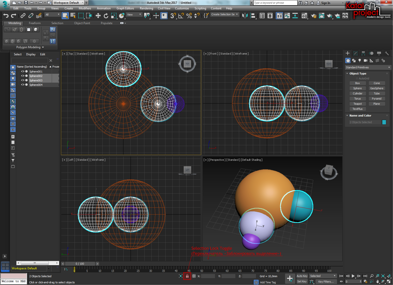Блокировка выделения предохраняет от случайного выделения каких либо дополнительных элементов на сцене. Когда блокировка выделения активна, Вы можете производить любые действия в окнах проекций, не боясь сбросить выделение с интересующих Вас элементов.