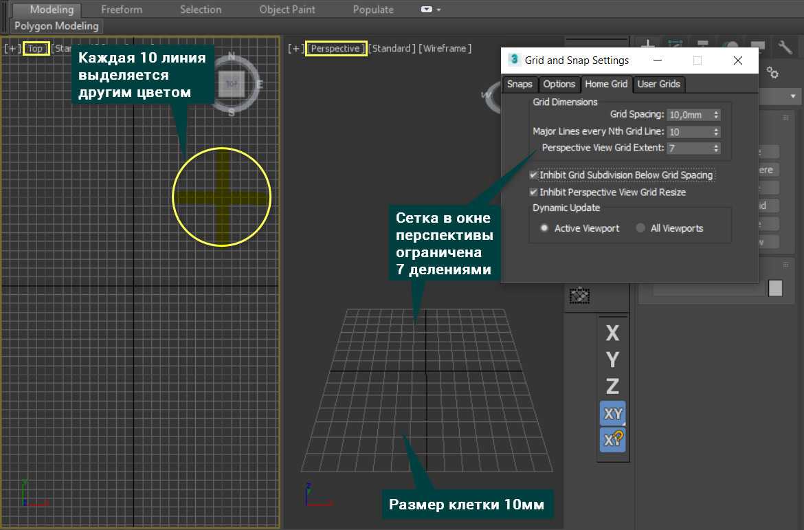 В полях раздела Grid Dimensions можно изменить деление сетки и частоту показа основных линий. Если убрать галочку напротив параметра Inhibit Perspective view Grid Resize, то в окне перспективы сетка станет бесконечной.