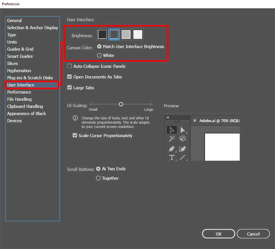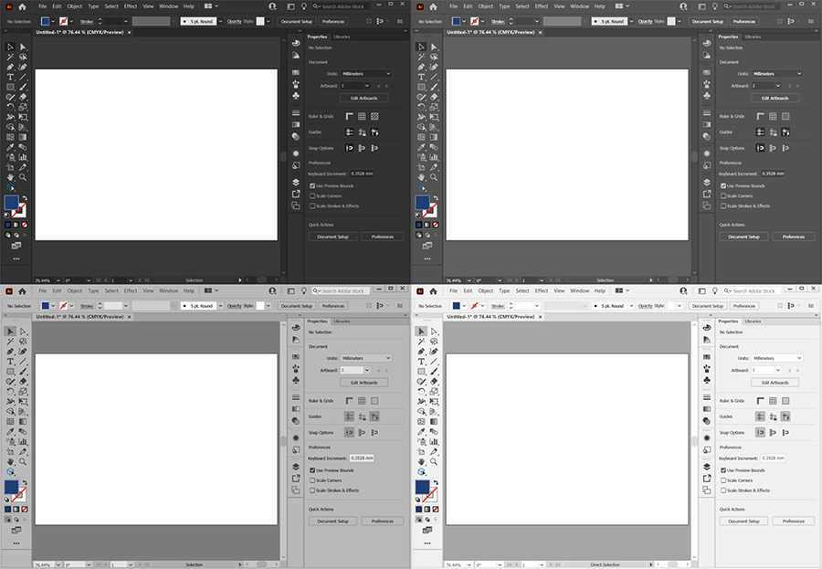Программа Adobe Illustrator предлагает четыре варианта яркости интерфейса: Dark, Medium Dark, Medium Light и Light.