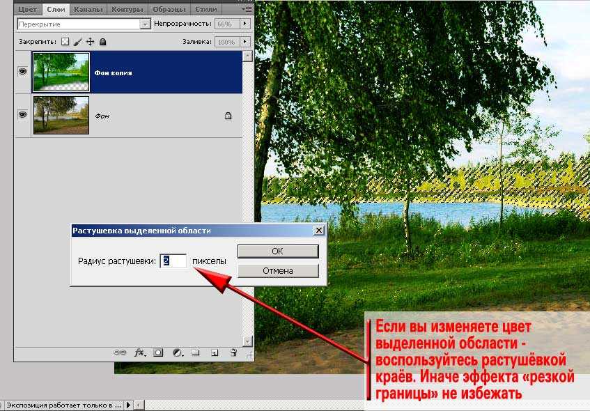 Замечание: растушёвка при выделении обязательна. Иначе получаются рваные резкие границы перехода цвета. Это признак неумелой коррекции. Да и выглядит такое фото «на троечку».