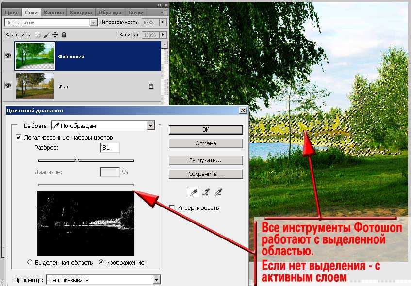 Теперь стоит обратить внимание на одну особенность, о которой мы упоминали только вскользь. Любой инструмент программы Adobe Photoshop работает с выделенной частью выбранного слоя