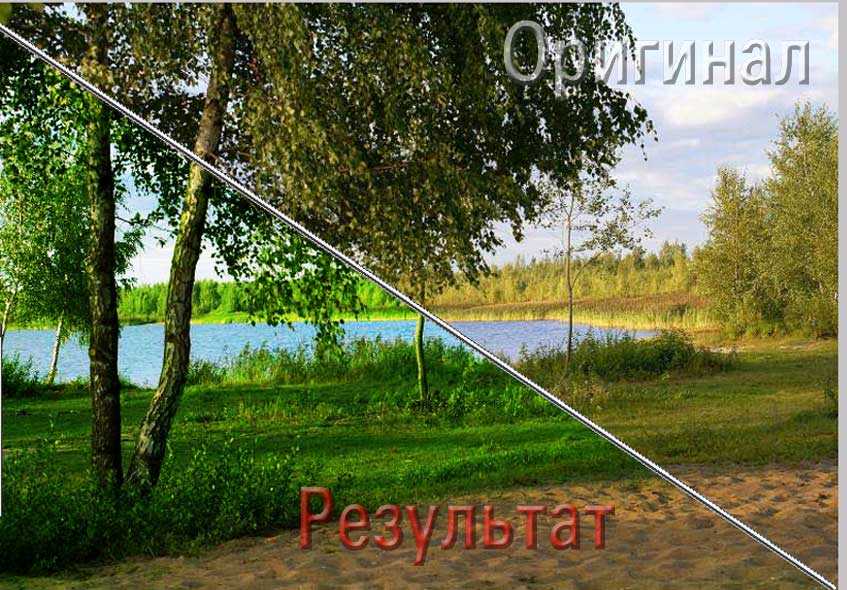 Посмотрите на рисунок ниже. Светлые области леса за озером после общего изменения цвета на фотографии приобрели ярко-жёлтый оттенок.