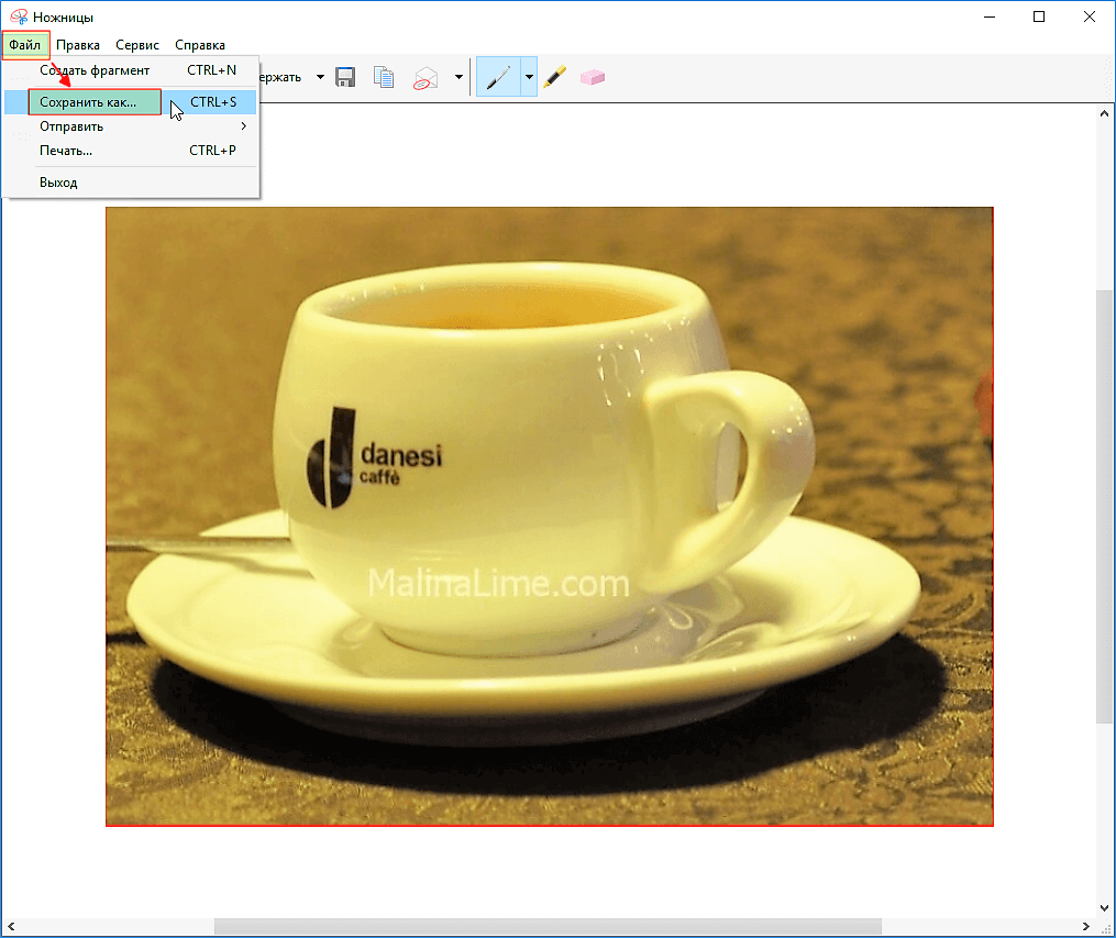 Отпустите кнопку мыши и перед вами откроется рабочее окно «Ножниц» с вставленным в него фрагментом обрезанного фото. Осталось только сохранить снимок. Нажмите «Файл» влевом верхнем углу рабочего окна. В открывшемся списке выберите «Сохранить как…»