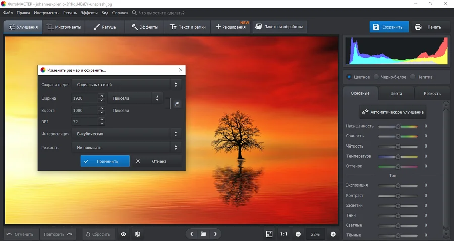 В главном меню раскройте пункт «Файл» и найдите функцию «Изменить размер и сохранить». Укажите цель экспорта в пункте «Сохранить для» — в этом случае редактор самостоятельно подберет оптимальные настройки. Либо введите параметры ширины и высоты вручную. Программа позволяет указывать параметры в пикселях, дюймах, процентах, см, мм.