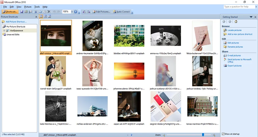В стартовом окне отобразятся все фотографии из папки «Изображения». Чтобы открыть медиафайл из другой директории, кликните File и выберите Add Picture Shortcut. Укажите папку, в которой находится необходимое изображение.