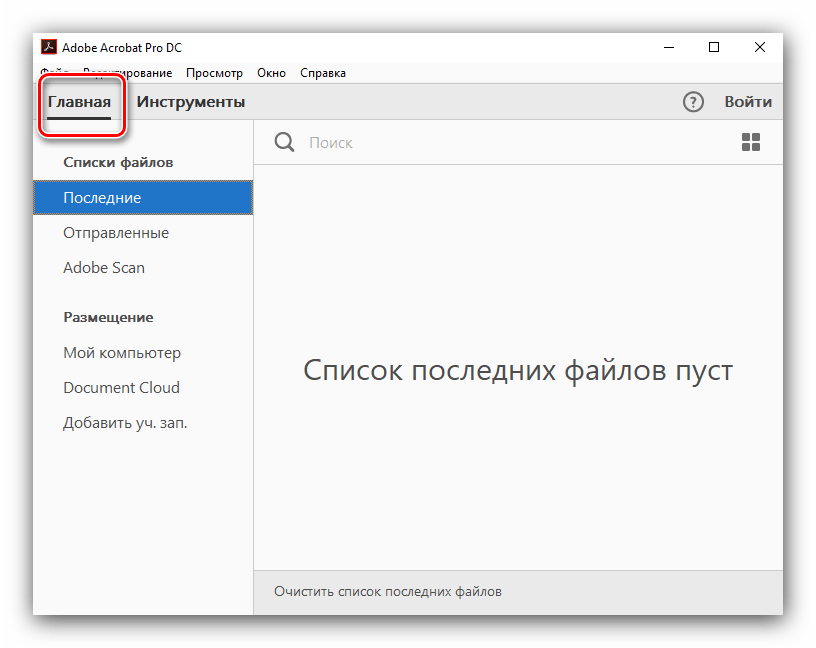 - После установки откройте программу Adobe Reader. Перед вами появится вкладка «Главная», с которой можно начать редактирование PDF-документа.