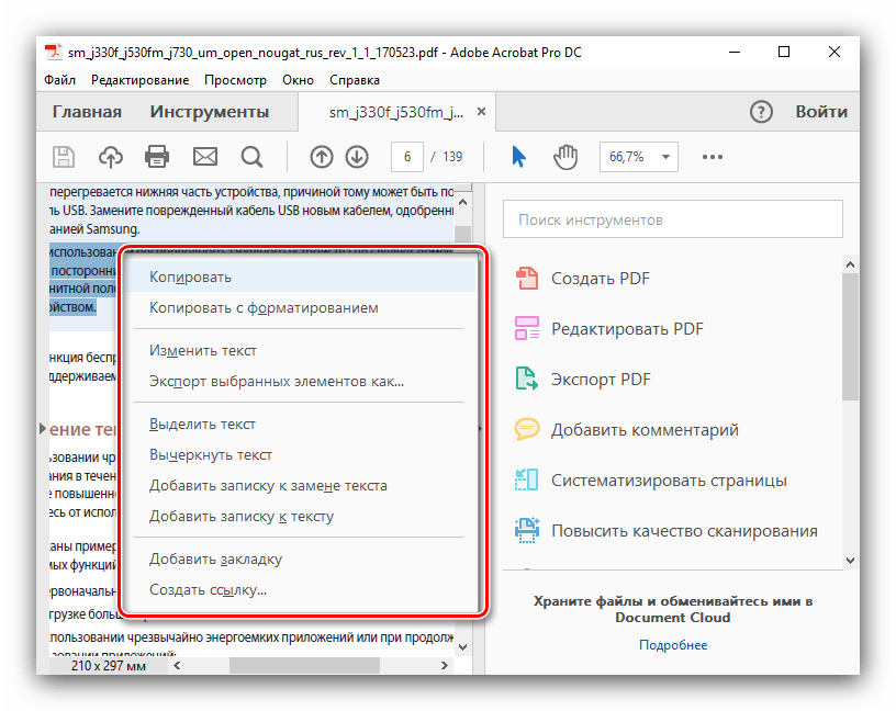 Чтобы приступить к редактированию текста в электронной книге формата PDF, необходимо выделить участок текста и кликнуть на него правой кнопкой мыши. В появившемся меню выберите: