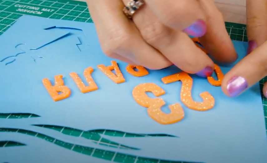 - Также по шаблону из бумаги другого цвета вырезаем цифры и буквы, то есть «23 февраля». Приклеиваем на открытку.