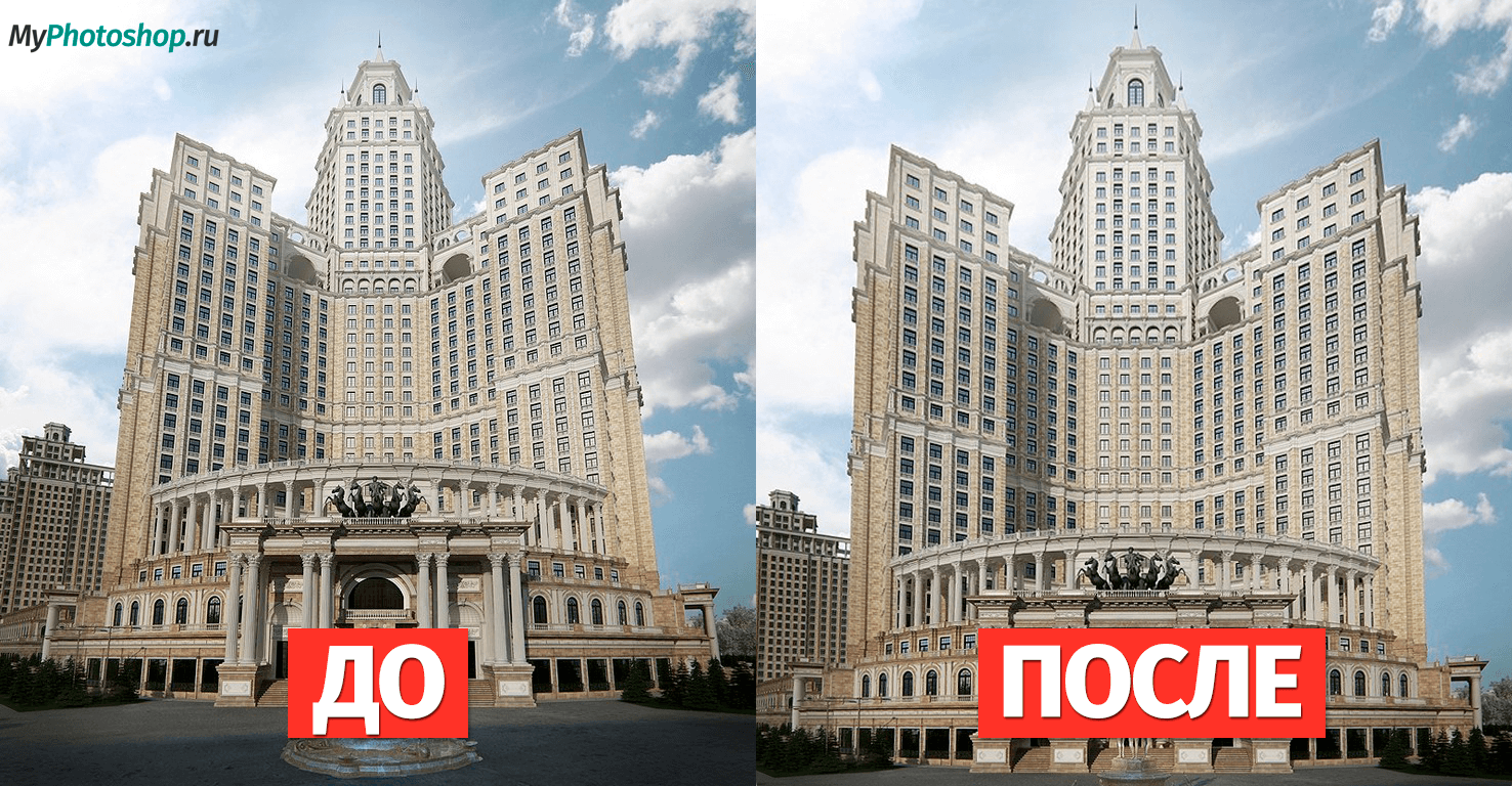 Основной причиной создания инструмента Деформация перспективы – изменение перспективы объектов на фотографии. Рассмотрим работу этого инструмента на примере здания.