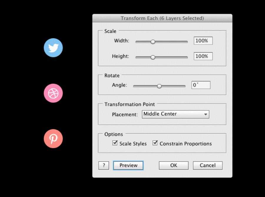 Если ваша задача состоит в том, чтоб изменить или повернуть несколько объектов, расположенных на разных слоях, вам понадобится Transform Each Photoshop. Кнопка предварительного просмотра позволяет просмотреть, как выглядят все внесенные изменения перед их применением.