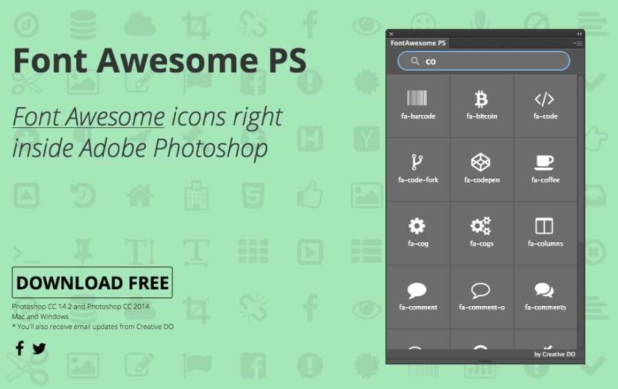 FontAwesome – это огромная коллекция из 675 различных иконок, содержащих все возможные глифы для UI дизайна, макетирования и т.д. FontAwesomePS – бесплатный плагин, который добавит все это в Photoshop без каких-либо проблем. Иконки полностью масштабируются и могут быть изменены как любой другой векторный объект. Этот плагин незаменим для веб-дизайнеров.