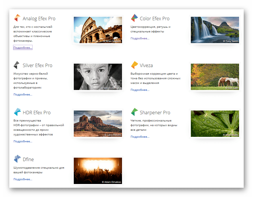 Одними из полезнейших плагинов является пакет Nik collection от Google, компоненты которого можно использовать в Lightroom и Photoshop. На данный момент плагины являются уже бесплатными. Эти инструменты отлично подойдут профессионалам, но новичкам они тоже не помешают. Устанавливается как обычная программа, вам лишь нужно выбрать в какой фоторедактор его встроить.