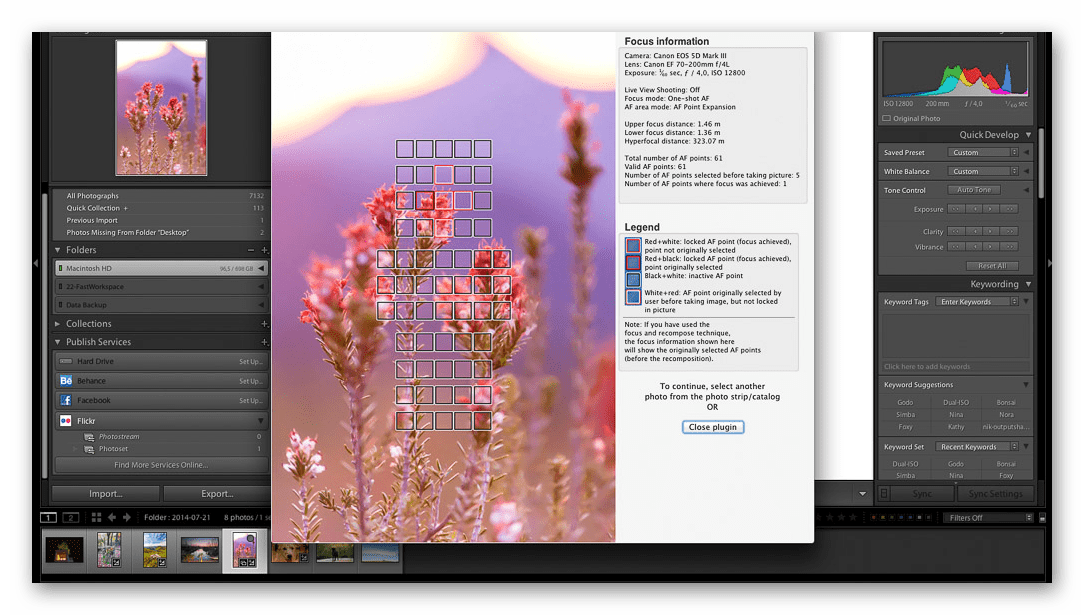 Show Focus Points специализируется на поиске фокусировки снимка. Так, вы сможете выбрать из множества практически одинаковых фотографий самую лучшую или подходящую. Плагин работает с программой Lightroom начиная с 5 версии. Поддерживает основные камеры Canon EOS, Nikon DSLR, а также некоторые Sony.