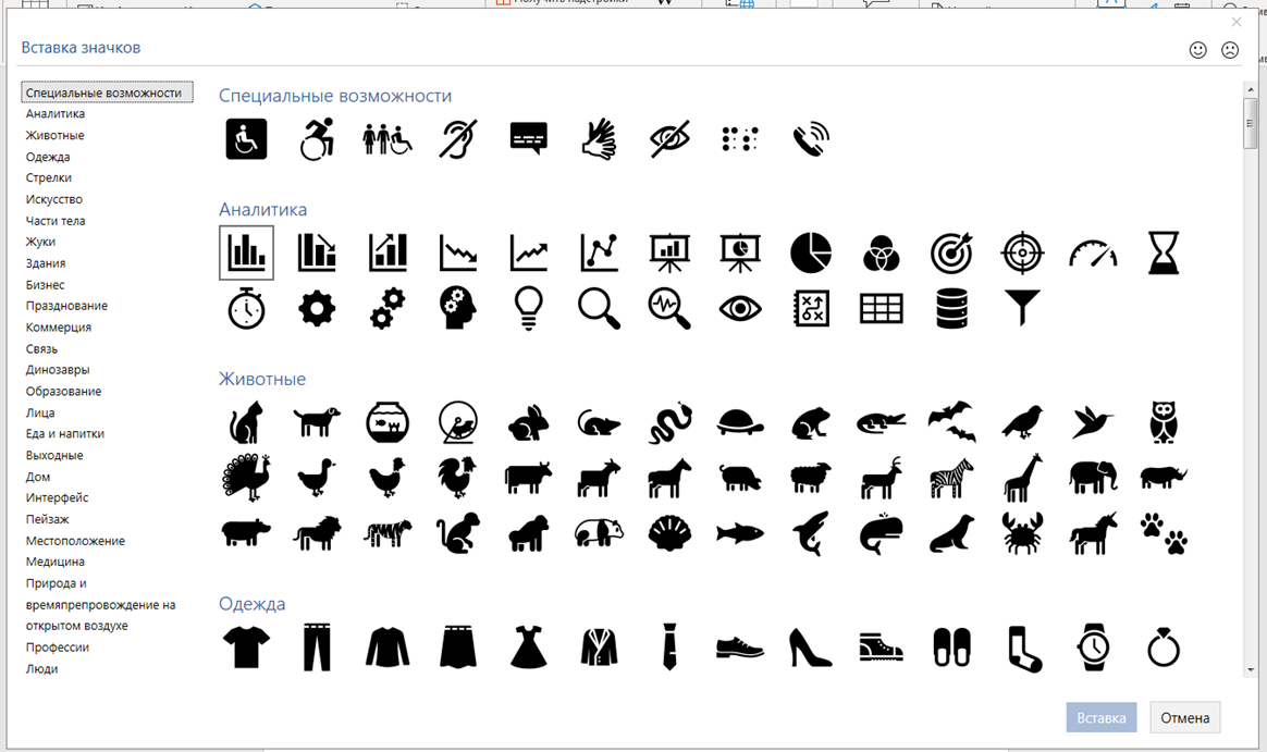 При нажатии на кнопку Значки откроется окошко выбора значков, которое содержит множество пиктограмм, разделенных на различные группы: