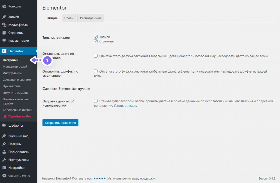 Настройки Elementor