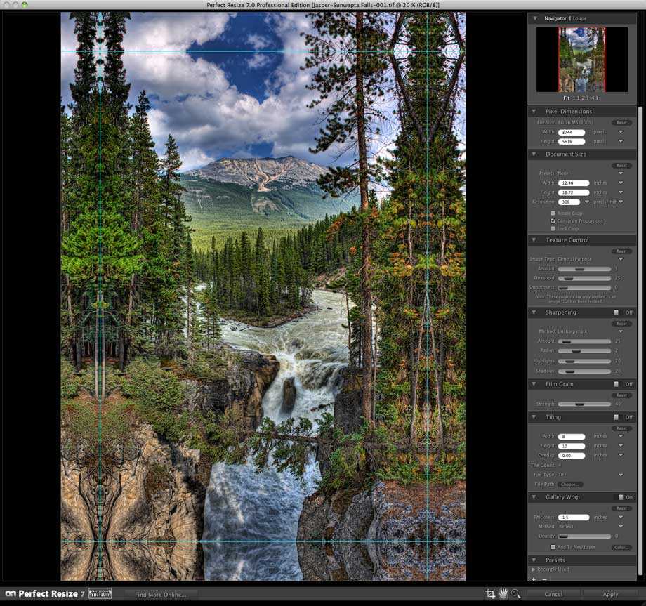 One of the negatives of printing on canvas with a gallery wrap is that you have to sacrifice the edges of your image to stretch or wrap around the inner wood stretcher bars. With Perfect Resize’s Reflect option, you no longer have to worry about this. In the image above you’ll notice the cyan lines once again. This time they represent the edge of the image where the wrapping will begin. As you can see, I selected the Reflect option, and this mirrored the set amount of space inside the image that will be wrapped. In this case, I chose 1.5 inches, and the image below shows you a clear example of the final Gallery Wrap-effect with the Reflect option selected. This way, no image area is sacrificed and you can show off your prints with the intended cropping.