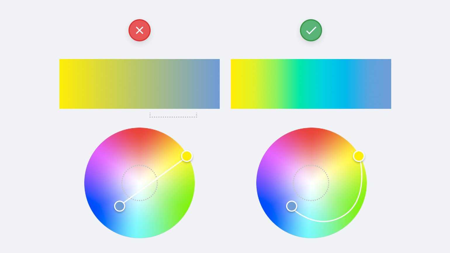 По сути, в этом случае градиент будет строиться не по прямой от одного цвета к другому, а с использованием промежуточных точек ближе к краям цветового круга.