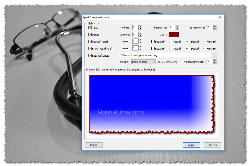 - Водяной знак. Можно сразу и водяной знак нанести. Причем мышью он легко перетаскивается в любое место изображения. Прозрачность, точнее Непрозрачность, тоже настраивается. Минусы только в том, что нет предпросмотра конечного результата и что надо заранее создать файл водного знака. Есть способы и получше. Возможно Вам будет интересно Как поставить водяной знак на фото.