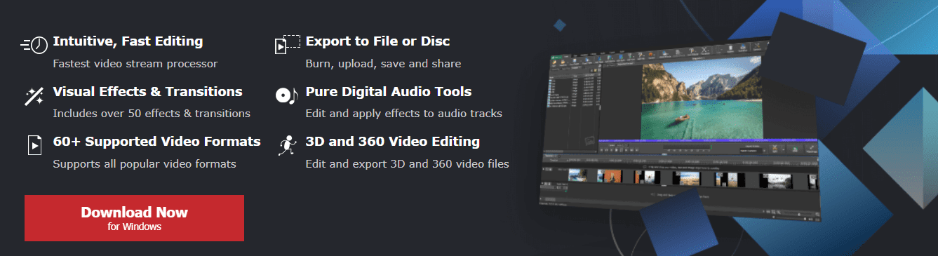 Это быстрый, интуитивно понятный и простой в использовании инструмент, позволяющий добавлять переходы и специальные эффекты. Если вы хотите разделить большие 3D- или 360-градусные видеофайлы и позже записать их на переносное устройство, то VideoPad — лучший вариант для вас.