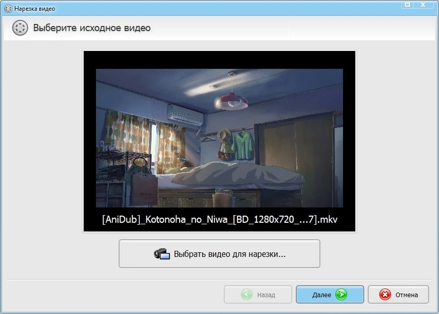 - Кнопки выбора кадров для вырезания: начало и конец для вырезания фрагмента видео файла.