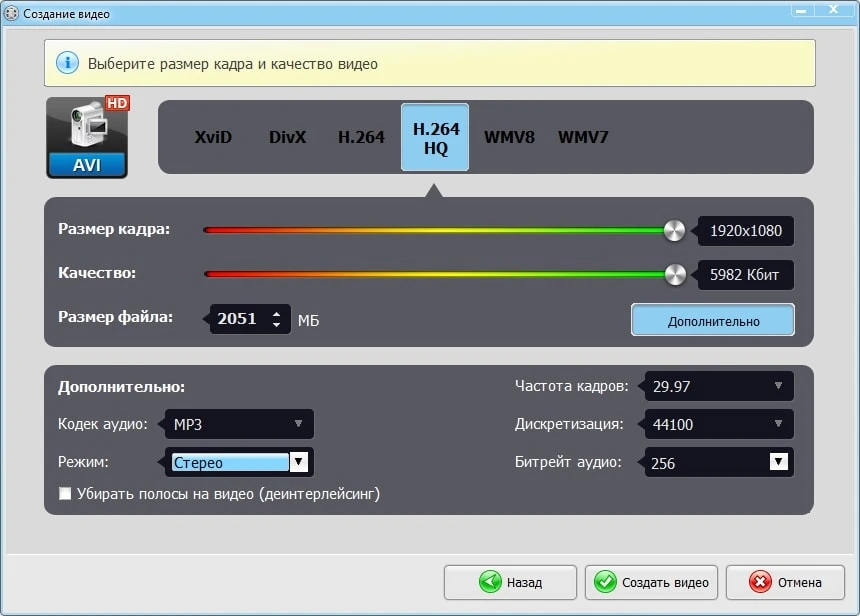 качество и кодек для экспорта. После выбора всех параметров кликните «Создать видео» и укажите место сохранения.