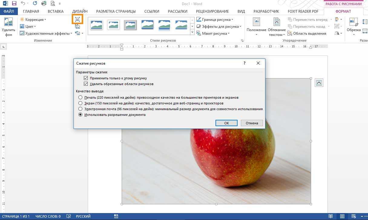 Для исправления такой ситуации, можно воспользоваться сжатием изображений. Для этого кликните на ленте Формат – Изменение – Сжать рисунки