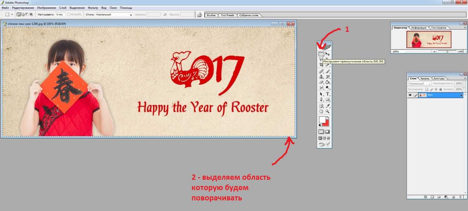 Самый простой способ поворота будет такой. Выбираем «Инструмент прямоугольная область», смотрите под цифрой 1. Выделяем область подлежащую редактированию.