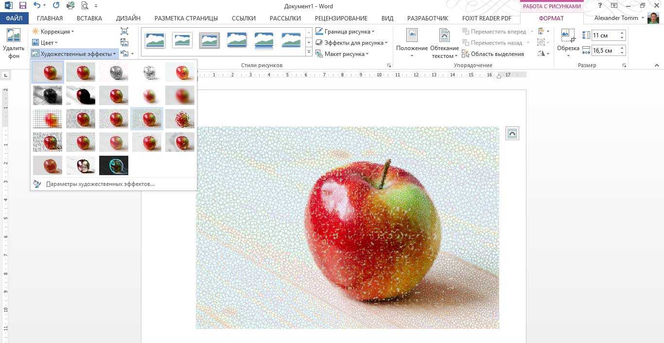 Интересный результат дают художественные эффекты. Чтобы стилизовать картинку – кликните на ленте Формат – Изменение – Художественные эффекты