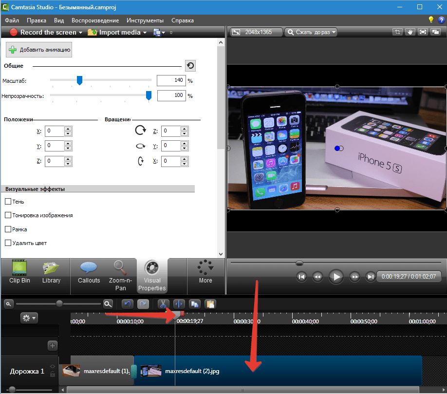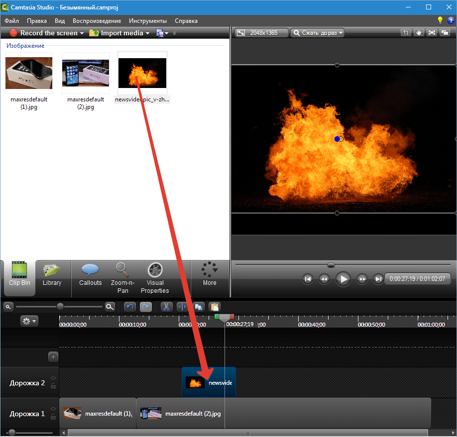 1. Перетаскиваем изображение (видео) на вторую дорожку так, чтобы оно находилось поверх нашего клипа. Дорожка создается автоматически.