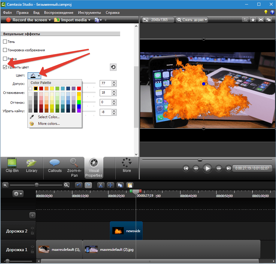 2. Идем в визуальные свойства и ставим галку напротив «Удалить цвет». Выбираем черный цвет в палитре.