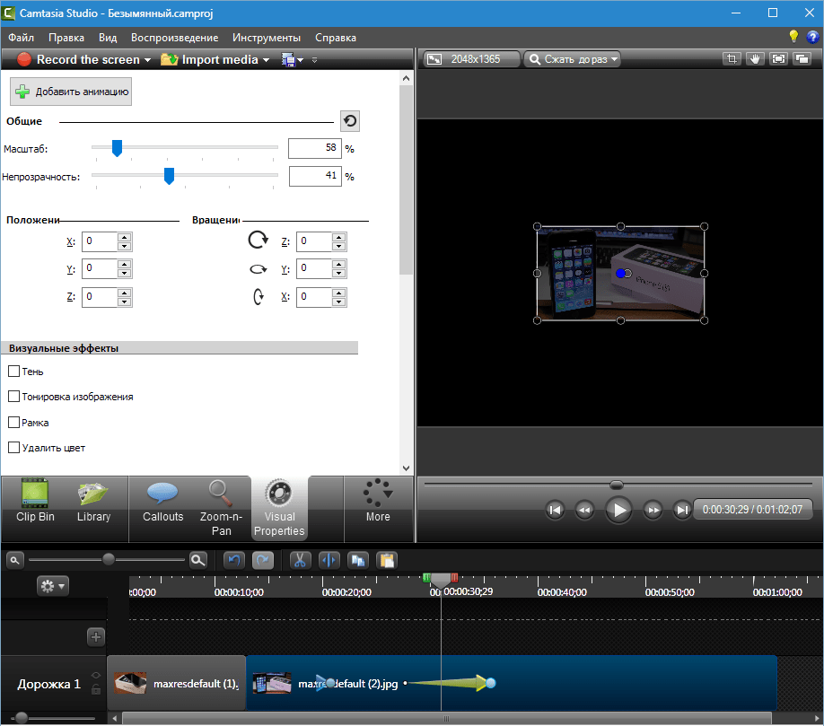 Данный вид эффектов позволяет изменять размеры, прозрачность, положение на экране для изображений и видео. Также здесь можно вращать картинку в любых плоскостях, добавлять тени, рамки, тонировать и даже удалять цвета.