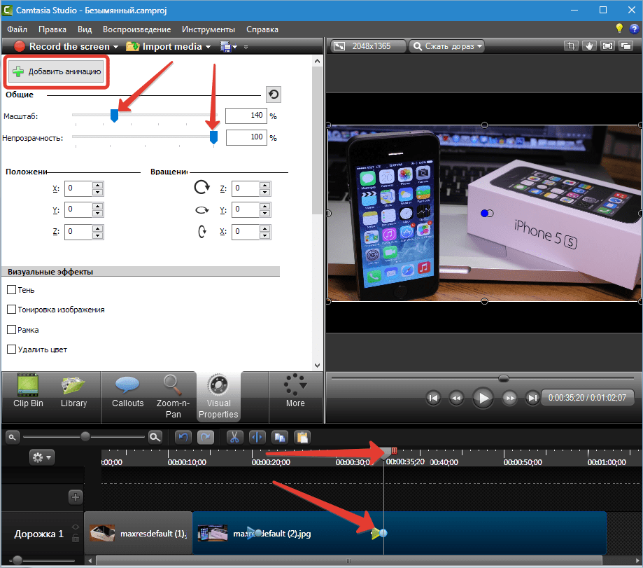 3. Теперь переходим в то место, где планируем получить картинку полного размера и снова нажимаем «Добавить анимацию». Возвращаем ползунки в исходное состояние. Анимация готова. На экране мы видим эффект появления картинки с одновременным приближением.