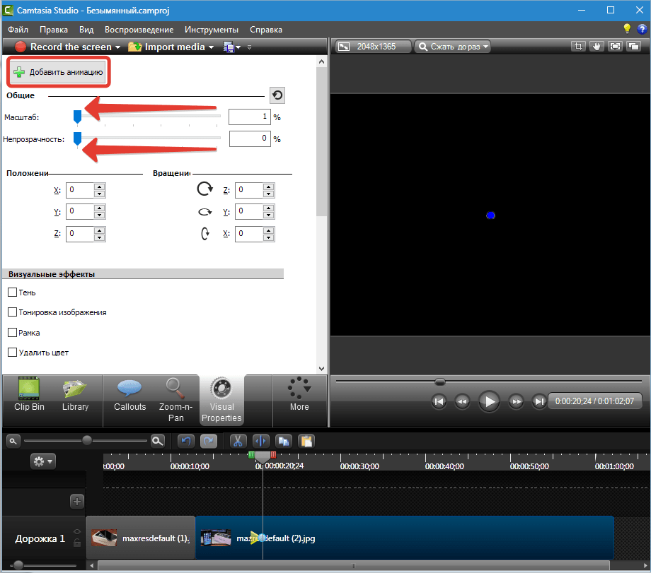 2. Нажимаем «Добавить анимацию» и редактируем её. Перетягиваем ползунки масштаба и непрозрачности в крайнее левое положение.