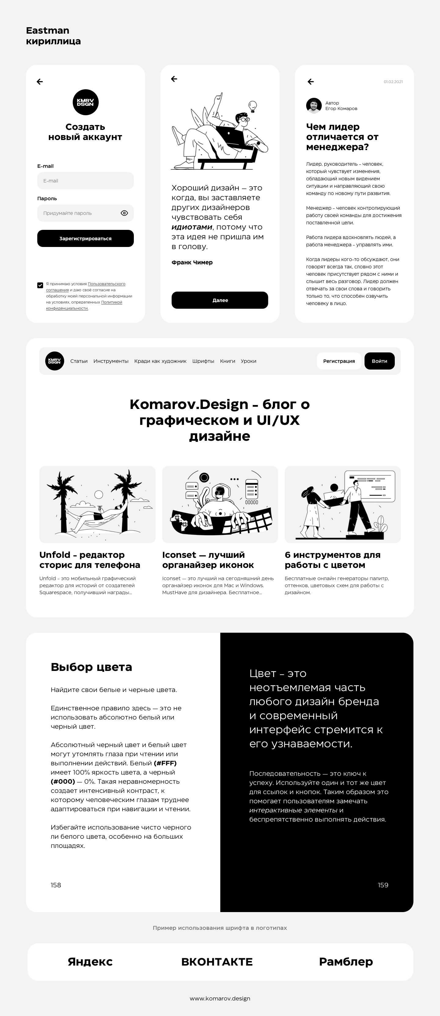 Кириллический шрифт Eastman был разработан в 2020 году для Zetafonts Франческо Кановаро и Андреа Тартарелли с помощью Соленн Бордо. Это семейство рабочих лошадок с геометрическим рисунком, разработанное для максимальной универсальности как при отображении, так и при использовании текста, с широким диапазоном веса и прочной монолинейной конструкцией с высокой высотой x, что делает Eastman чрезвычайно удобочитаемым на бумаге и на экране. Стоимость Eastman Full Family 297$Скачать шрифт: Eastman