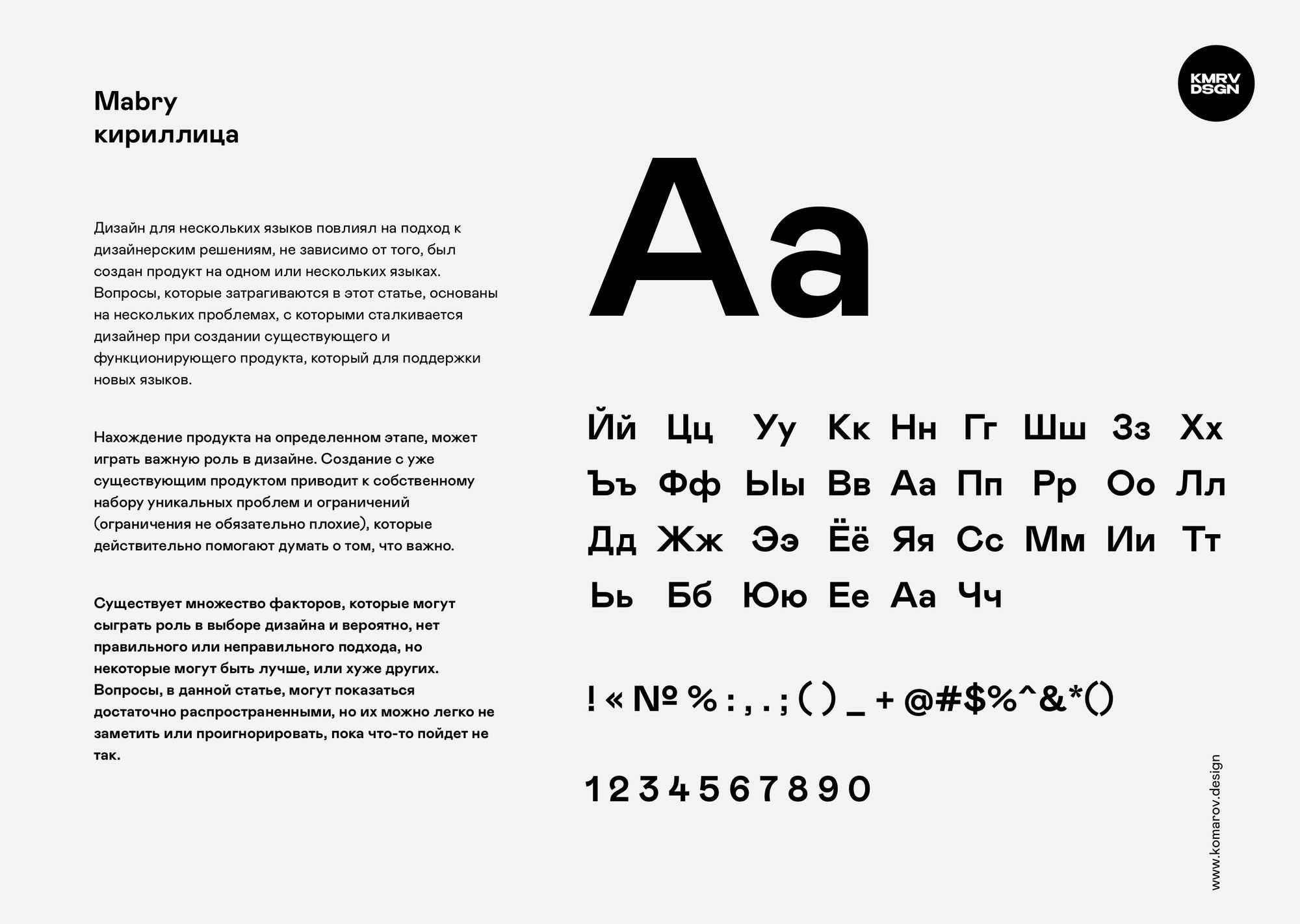 Стоя одной ногой среди идиосинкразических форм гротесков конца 19 века, а другой — среди рациональной математики геометрических шрифтов без засечек начала 20 века, Мабри позиционирует себя как несколько вещей одновременно: современных и исторических, строгих и жестких, объективный и субъективный, культурный и неточный; одновременно изысканный и грубый.Красивый и удивительный шрифт.