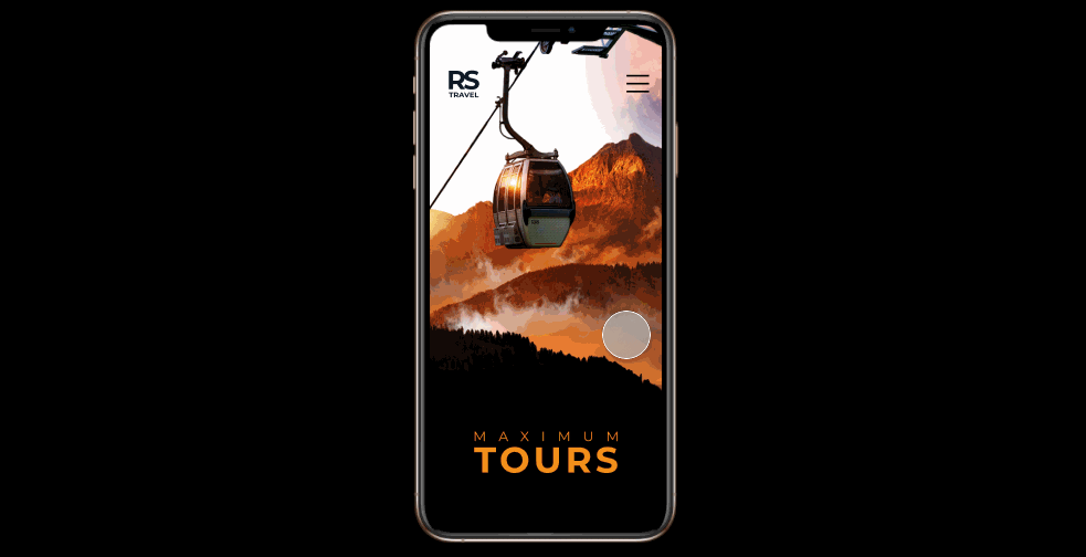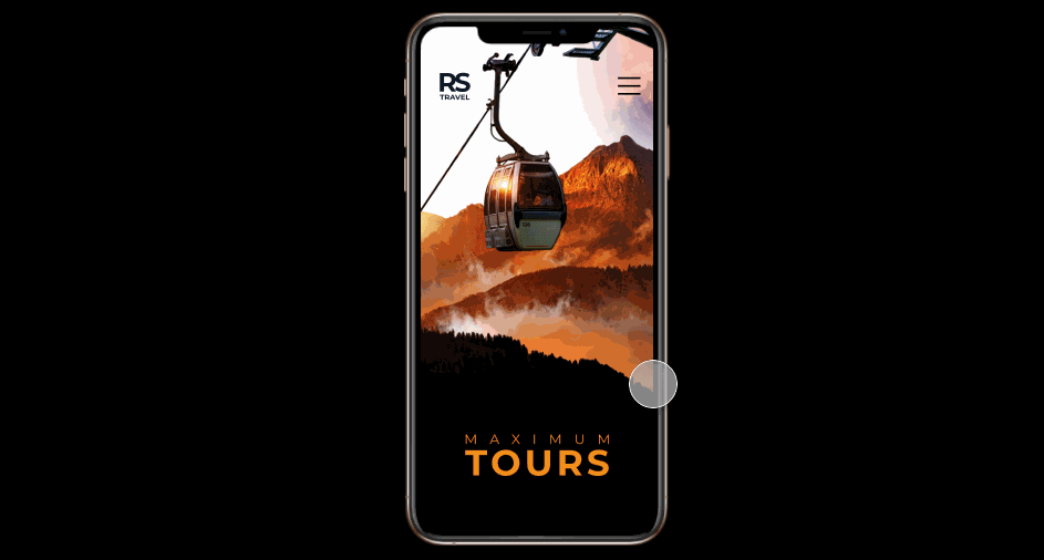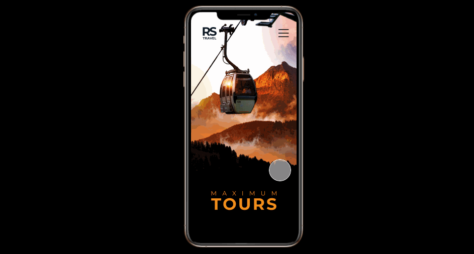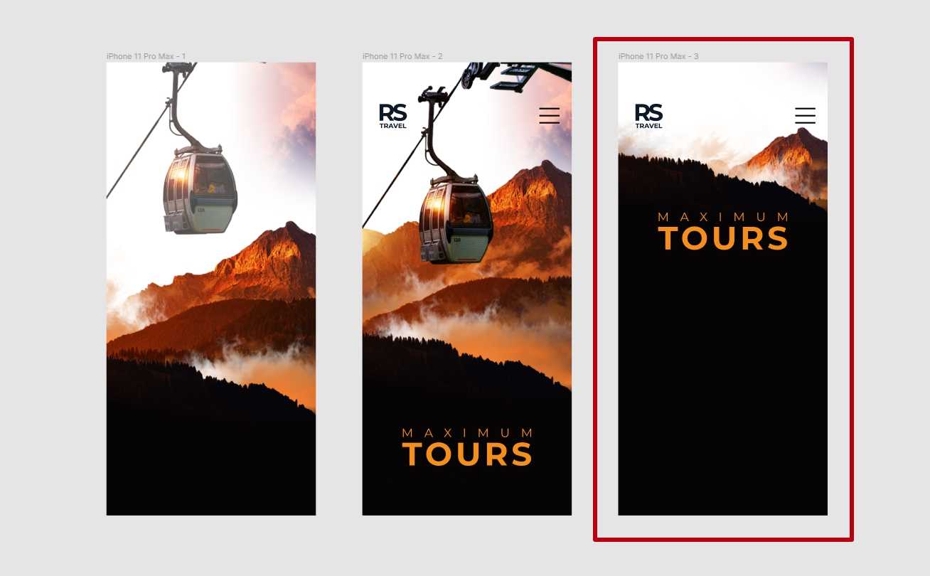 Слои на третьем фрейме в этот раз сдвигаем вверх: вагончик уезжает за пределы фрейма, темная гора доезжает до логотипа, фоновая гора чуть смещается вверх, облака практически исчезают, надпись смещается вслед за темной горой: