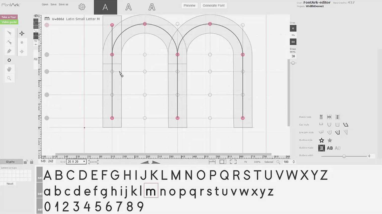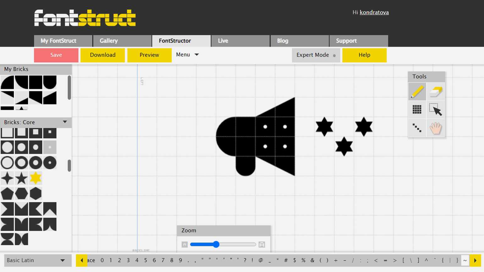 Также к плюсам можно отнести простой интерфейс, понятные инструменты, удобную сетку, что важно при создании шрифта. Сервис позволяет изменять расстояние между глифами и наглядно показывает, как символы будут смотреться в сочетании друг с другом