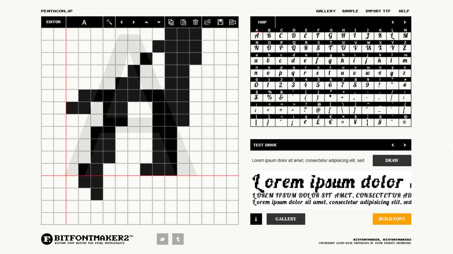 BitFontMaker помогает создавать пиксельные шрифты. Пользователь может сам придумывать форму и начертание, словно рисуя на клетчатой бумаге. Также есть возможность преобразовать в пиксели любой шрифт, загрузив его с компьютера и изменив при необходимости.