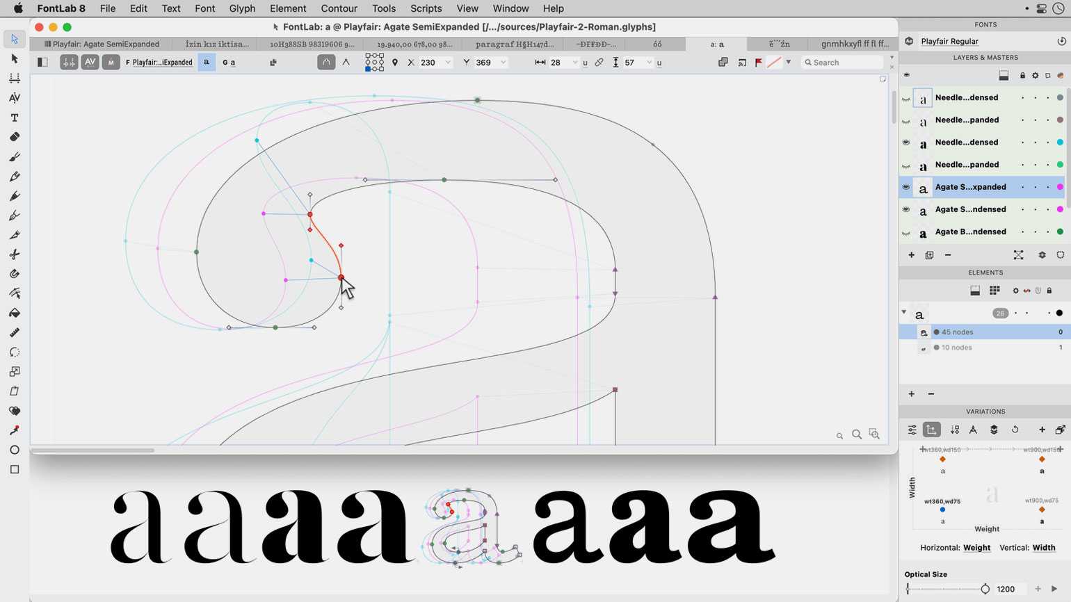 Тонкие настройки позволяют регулировать соотношения элементов шрифта, настраивать расстояние между символами и создавать кернинговые пары, просматривать редактируемые буквы в массиве текста и многое другое. Поддержка Unicode дополняет латиницу иероглифическими шрифтами, символами, значками и эмодзи.